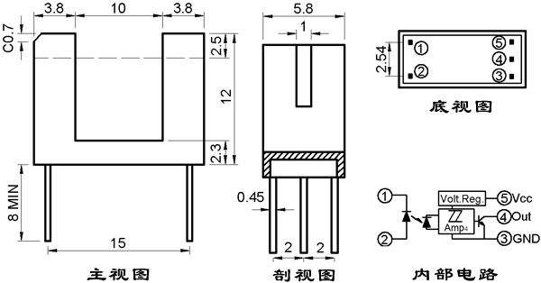 一、特点: ● 单光束施密特三极管集电极开路输出 ● 光缝宽度(分辨率):1mm;光轴中心:2.5mm。 ● IT1106H 为通光高电平输出, IT1106L 为通光低电平输出。
